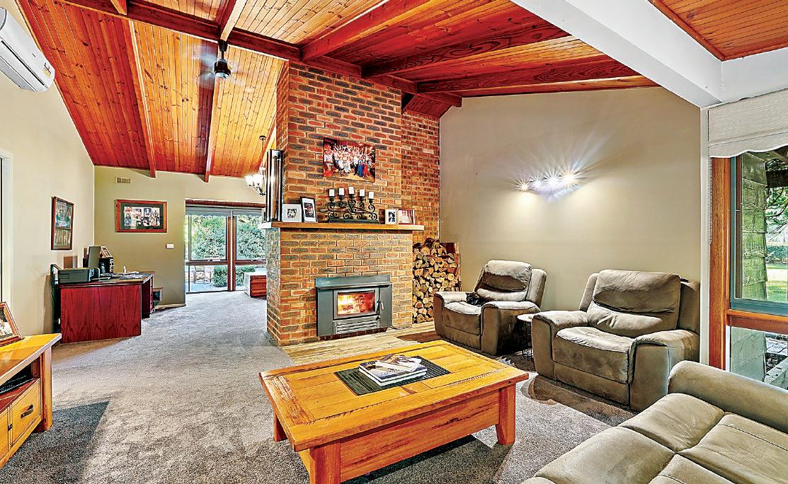 Adjoining is the living room, a relaxed space with cathedral ceilings, exposed timbers and a brick fireplace with a built-in solid fuel heater.