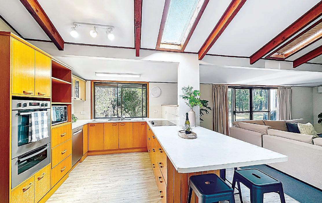 Timber cabinets, refurbished benchtops and splash tiles are included in the kitchen, together with a step-in corner pantry, breakfast bar, Westinghouse induction cooktop, dual wall ovens, Bosch dishwasher and fixtures for a plumbed fridge.