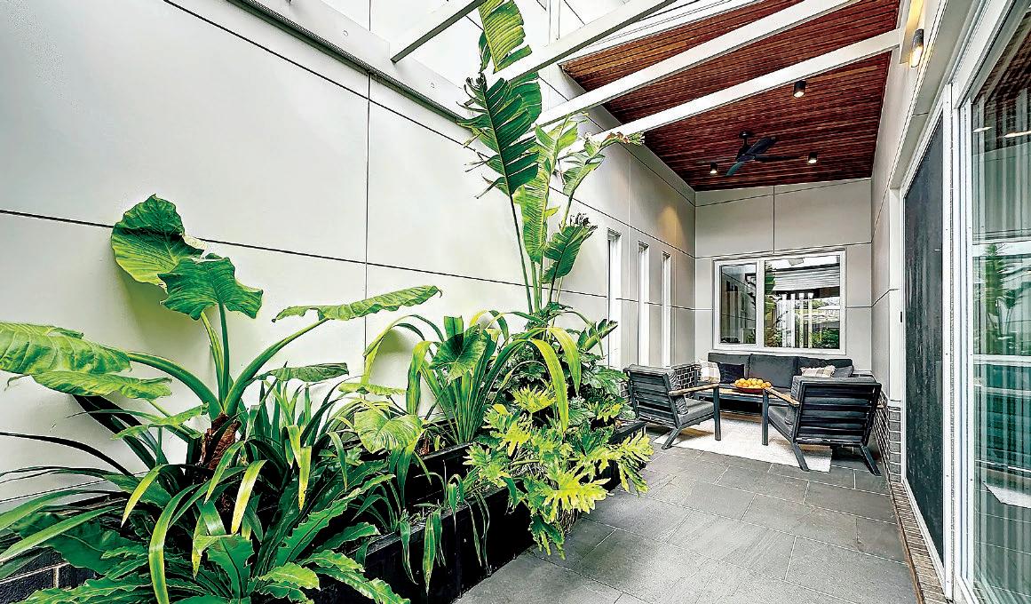 Two sets of large sliding doors from the living area open to the courtyard, a semi-covered space, perfect to capture the winter sun and a cool spot to dine in the summer.