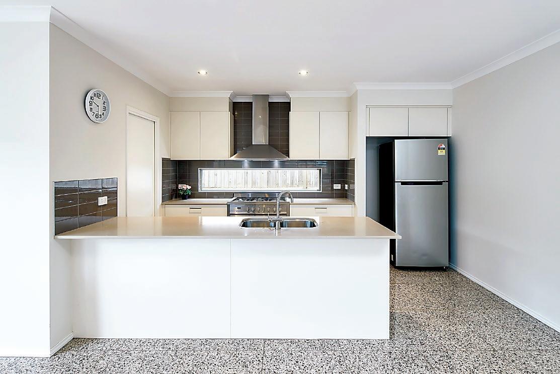 Well equipped for the home chef, the kitchen features sleek off white cabinetry, matte white splash tiles, ceramic cooktop, electric oven, dishwasher and an island bench.