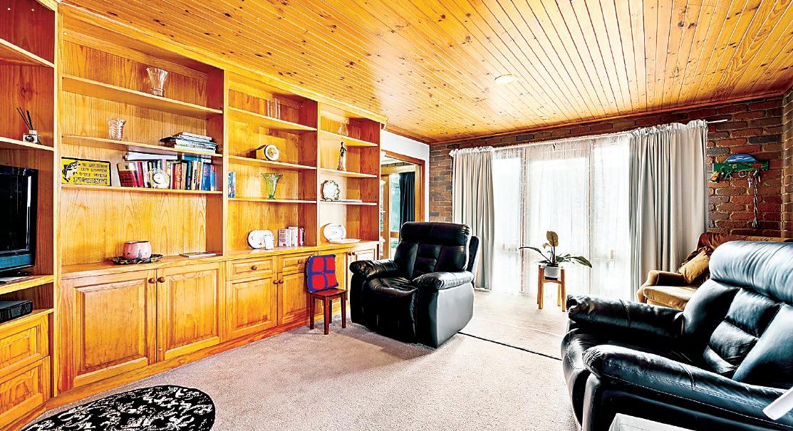 Adjacent is the spacious formal living and dining room, a third living area with inbuilt cupboards and shelving adjoins the dining area.