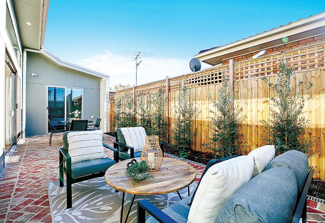 Two sets of stacking doors from the living area connect a private north facing, paved patio.
