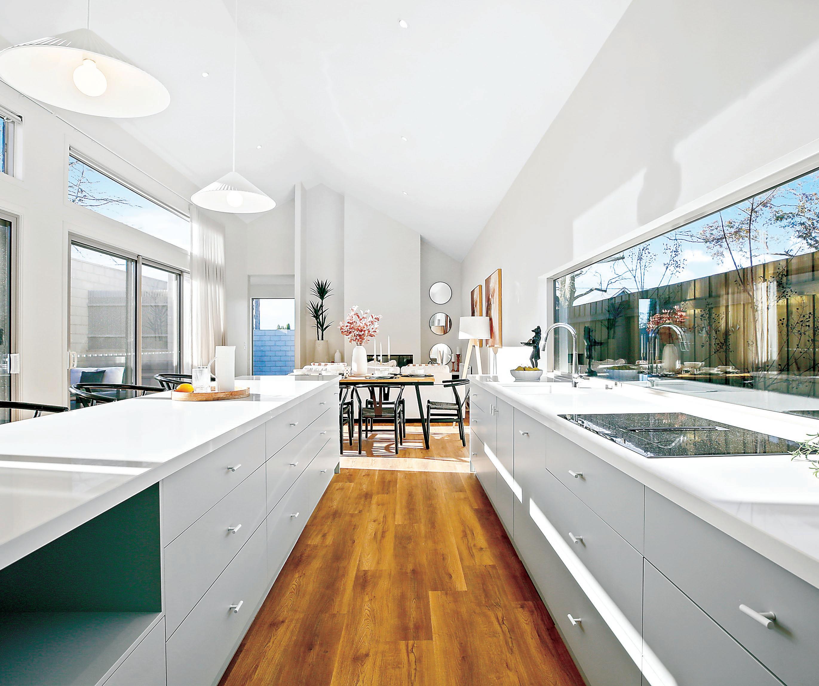 A window splashback above the undermount sinks and cooktop allows more light into the work space.