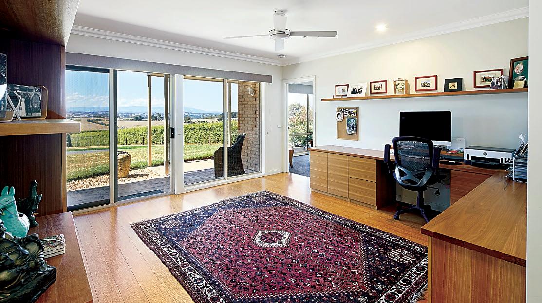 The second living area is currently utilised as a home office with an inbuilt desk, storage and display shelves.