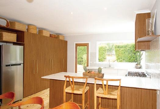 The kitchen and dining area flows into a large living space and out onto an adjoining
