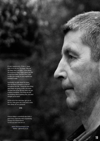 Frances Bibby is somebody who loves a good story. Especially tales of positivity, change and independence. To find out more visit her at: w w w.the nle ts b e g i n .co m Twitter - @Frances_M_B