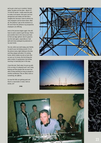 we’ve got a start up in Cumbria.’ Details aside, he gives me the date - March 11th. I’m lost for words. I really need the wife to make it all clearer. She puts it all into perspective and makes me feel like a naughty kid, because I have to phone my new employers and let them down. After all, the pittance I get at the moment is a bit more than the pittance my prospective employers are offering. And so the process begins again. We still have to work a week to get full pay. That’s just another kick in the nuts as we have to fork out digs upfront. But it’s great to see the lads again, especially as I had well and truly outstayed my welcome in my own home. You see, when you work away, your family is used to you not being around. I’m on the phone every night talking to the kids and they always ask when I’m coming home, which makes my job so hard. But as soon as I’m home, the first thing she asks is when I’m going back. By Sunday morning I’m basically just in the way. I love this job. That’s why I’ve put up with it for so long. It’s physical and I can’t help feeling sad that people like me won’t be able to keep working as long as people in another profession, like an office clerk or something. No offense. So now the bills are getting paid and there’s a new boiler in town. Roll on winter, eh? End