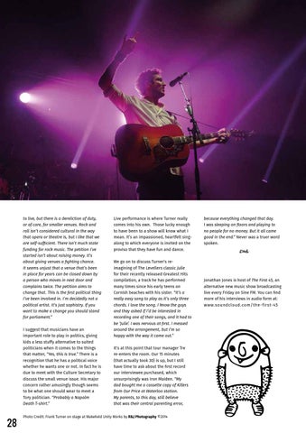 to live, but there is a dereliction of duty, or of care, for smaller venues. Rock and roll isn’t considered cultural in the way that opera or theatre is, but I like that we are self-sufficient. There isn’t much state funding for rock music. The petition I’ve started isn’t about raising money. It’s about giving venues a fighting chance. It seems unjust that a venue that’s been in place for years can be closed down by a person who moves in next door and complains twice. The petition aims to change that. This is the first political thing I’ve been involved in. I’m decidedly not a political artist. It’s just sophistry. If you want to make a change you should stand for parliament.” I suggest that musicians have an important role to play in politics, giving kids a less stuffy alternative to suited politicians when it comes to the things that matter, “Yes, this is true.” There is a recognition that he has a political voice whether he wants one or not. In fact he is due to meet with the Culture Secretary to discuss the small venue issue. His major concern rather amusingly though seems to be what one should wear to meet a Tory politician. “Probably a Napalm Death T-shirt.”