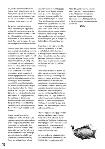 monetary payment from the people he paints for. He'd much rather be given good coffee than cash. He painted a fantastic mural for The Telling in the courtyard of Church View - the former art college behind the Minster, opposite Tesco car park - and he donated the images which make up the cover, back and centre of the magazine you are now holding, completely free of charge. Phlegm also loves Doncaster and has vowed to return to paint again. If Phlegm has faith in Donny, then so should we. Regardless of city bids, we need to start acting like a city, or at least a unified whole rather than lots of towns fighting for their own small slice of an ever-dwindling pie. We need to celebrate Doncaster’s culture, arts, style, music, people, fashion, lifestyle, architecture and even its coal-black underbelly. There's no better time to do this. All cities are at their most creative when they’re still raw (poor) and eager for change, a process which has a limited shelf-life thanks to the inevitable gentrification of once-bohemian areas. Who’s to say that those ‘brawling boys’ are not in fact angst ridden, hormone driven poets whose musings will one day put the city of Doncaster on the map. Why can’t a girl be a sociocultural heavyweight just because she chooses to spend her Friday nights ‘half naked’. And who’s to say a ‘cold kebab’… No, even I can’t find a way to redeem a cold kebab. The Doncopolitan will big up our little city (big town) as if it were London, Paris or New York, although Donny would be the ‘Big Rhubarb’ rather than the ‘Big Apple’. Even if Doncaster never becomes a city, this magazine will act as a showcase for what truly is an underrated gem of a town. So come on Donny, let's get together and get stuff done. Walk the walk. Talk the talk. Start every sentence with