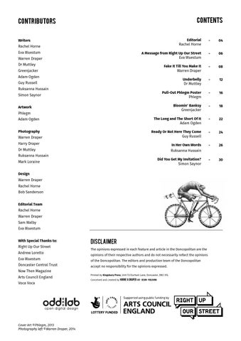 Mark Loraine Design Warren Draper Rachel Horne Bob Sanderson Editorial Team Rachel Horne Warren Draper Sam Walby Eva Wuestum With Special Thanks to: Right Up Our Street Andrew Loretto Eva Wuestum Doncaster Central Trust Now Then Magazine Arts Council England Voca Voca