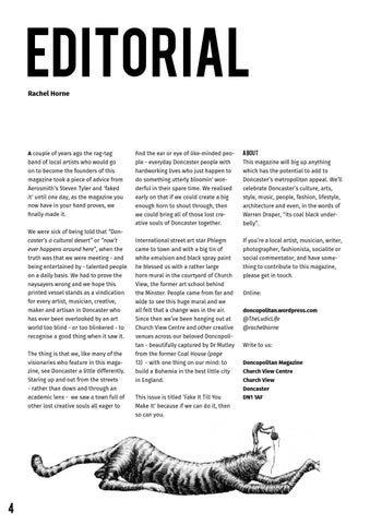 hardworking lives who just happen to do something utterly bloomin' wonderful in their spare time. We realised early on that if we could create a big enough horn to shout through, then we could bring all of those lost creative souls of Doncaster together. International street art star Phlegm came to town and with a big tin of white emulsion and black spray paint he blessed us with a rather large horn mural in the courtyard of Church View, the former art school behind the Minster. People came from far and wide to see this huge mural and we all felt that a change was in the air. Since then we’ve been hanging out at Church View Centre and other creative venues across our beloved Doncopolitan - beautifully captured by Dr Mutley from the former Coal House (page 13) - with one thing on our mind: to build a Bohemia in the best little city in England. This issue is titled ‘Fake It Till You Make It' because if we can do it, then so can you.