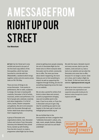 We wish the team a fantastic launch and every success. And to you the readers, come and join us, have a look at our website and see what the Doncaster arts scene has to offer, because it’s no longer a secret. Great art is here, and it really is Right Up Our Street. To find out more visit our website: rightupourstreet .org.uk