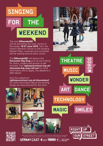 The DNweekeND will feature the Doncaster Big Sing and we are looking for choirs, singers and groups to get involved. Visit rightupourstreet.org.uk/ doncaster-big-sing-call-out for more information and to apply, the deadline is 30th March. Visit the website at rightupourstreet.org.uk/dnweekend for more information about the exciting things we have planned for the town.