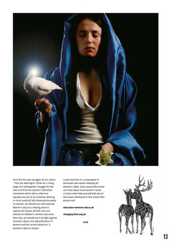 Louise Harrison is a campaigner in Doncaster who works tirelessly for women’s rights. If you would like to find out more about local women’s issues or if you need help yourself with any of the issues mentioned in this article then please visit: doncaster-womens-aid.co.uk changing-lives.org.uk End