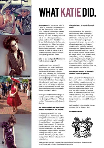WHAT KATIE DID. Katie Newsam has been on our radar for a while for her unique couture garments. Last year she appeared at Doncaster Races Ladies Day, competing in the Best Dressed Lady competition. She looked stunning. Her outfit, incredibly well made with its own petticoat, was timeless. Judges - we think Katie should have won. We love the fact that when the host asked each lady what they did and where they were from, Katie replied, “I’m a fashion designer based in Barnsley”. From this point on, we knew we needed to get to know this incredibly talented #GirlBoss bespoke designer a little better. Katie, we love what you do. What inspired you to become a designer? I was interested in art at school. I remember my final project being based around fashion illustration. I’ve always been a creative person so I’d happily spend hours sketching. John Galliano was my main influence when I was at college. I started off being more interested in the theatrics behind fashion. The avant-garde side to fashion is what I always wanted to get into, so I did quite a lot of fashion shows to promote myself, a couple of my favourites being Brighton Fashion Week and the Urban Music Awards. When I graduated I started working in a boutique, where I started selling some one-off designs, and the more I did that, I realised there was a market for bespoke clothing. How does it make you feel when you see someone wearing one of your designs? It’s the best part of what I do. I love seeing people look at themselves in the mirror, smile to themselves and say how great they feel. I think a lot of people like the idea that they’re wearing a one-off design, made to measure for themselves. I’ve had clients say to me in the past that strangers have asked if they’re wearing Alexander McQueen or Vivienne Westwood and they reply with, ‘No, it’s a Katie Newsam’. Makes me giggle that people could put me in the same category, but it’s very flattering.