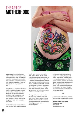 In a way Mandy was already a mother to quite a few - artists, designers and makers. I had a studio at Artfuel for six months, and it was the perfect place to develop new work and meet new creative people. So, mother of Artfuel and mother of two, congratulations on your new arrivals. Enjoy your maternity leave and the new babies. You’ve done plenty for the local creative scene and for that we are eternally grateful. End If you’re keen to find out more Artfuel is open Thursday - Friday 10.00am - 4.00pm. St James Court, St James Street, Doncaster, DN1 3QH 01302 360571 info@ar tfuel .org.uk