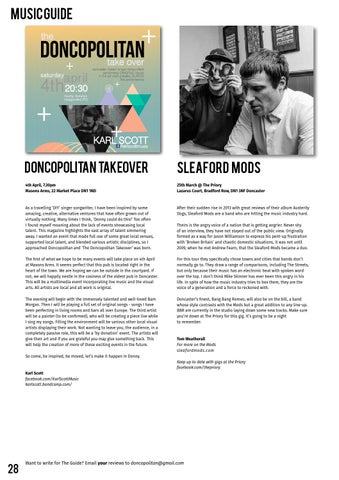 As a travelling ‘DIY’ singer songwriter, I havelive been inspired by some supporting ORIGINAL music amazing, creative, alternative ventures that have often grown out of virtually nothing. Many times I think, ‘Donny could do this!’ Too often I found myself moaning about the lack of events showcasing local talent. This magazine highlights the vast array of talent simmering away. I wanted an event that made full use of some great local venues, supported local talent, and blended various artistic disciplines, so I approached Doncopolitan and ‘The Doncopolitan Takeover’ was born.
