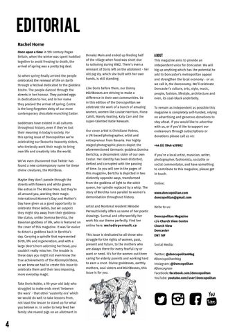 EDITORIAL Rachel Horne Once upon a time in 5th century Pagan Britain, when the winter was spent huddled together to avoid freezing to death, the arrival of spring was a pretty big deal. So when spring finally arrived the people celebrated the renewal of life on Earth through a festival dedicated to the goddess Eostre. The people danced through the streets in her honour. They painted eggs in dedication to her, and in her name they praised the arrival of spring. Eostre is the long forgotten deity of our more contemporary chocolate munching Easter. Goddesses have existed in all cultures throughout history, even if they’ve lost their meaning in today’s society. For this spring issue of Doncopolitan we’re celebrating our favourite heavenly sisters, who tirelessly work their magic to bring new life and creativity into the world. We’ve even discovered that Twitter has found a new contemporary name for these divine creatures, the #GirlBoss. Maybe they don’t parade through the streets with flowers and white gowns like extras in The Wicker Man, but they’re all around you, working their magic. International Women’s Day and Mother’s Day have given us a good opportunity to celebrate these ladies, but we suspect they might shy away from their goddesslike status, unlike Domina Berchta, the Bavarian goddess of life, who is featured on the cover of this magazine. It was far easier to detect a goddess back in Berchta’s day. Carrying a spindle that represented birth, life and regeneration, and with a large deer’s horn adorning her head, you couldn’t really miss her. The trouble is these days you might not even know the true achievements of the #DonnyGirlBoss, so we knew we had to create this issue to celebrate them and their less imposing, more everyday magic. Take Doris Noble, a 90-year-old lady who struggled to make ends meet ‘between the wars’ - that other ‘austerity era’ which we would do well to take lessons from, not least the lesson to stand up for what you believe in. In order to help feed her family she reared pigs on an allotment in