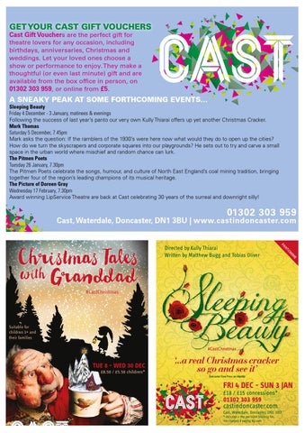 Sleeping Beauty Friday 4 December - 3 January, matinees & evenings Following the success of last year’s panto our very own Kully Thiarai offers up yet another Christmas Cracker. Mark Thomas Saturday 5 December, 7.45pm Mark asks the question: If the ramblers of the 1930’s were here now what would they do to open up the cities? How do we turn the skyscrapers and corporate squares into our playgrounds? He sets out to try and carve a small space in the urban world where mischief and random chance can lurk. The Pitmen Poets Tuesday 26 January, 7.30pm The Pitmen Poets celebrate the songs, humour, and culture of North East England’s coal mining tradition, bringing together four of the region’s leading champions of its musical heritage. The Picture of Doreen Gray Wednesday 17 February, 7.30pm Award winning LipService Theatre are back at Cast celebrating 30 years of the surreal and downright silly!