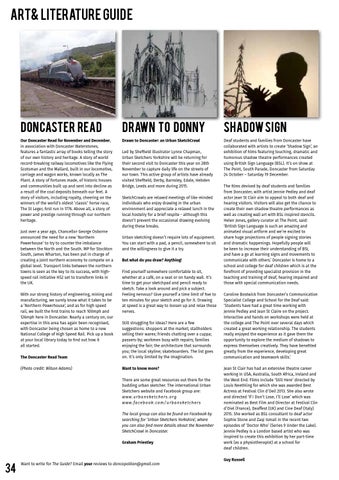 Want to know more? There are some great resources out there for the budding urban sketcher. The international Urban Sketchers website and Facebook group are: w w w. u r b a n s k e t c h e r s . o r g w w w. f a c e b o o k . c o m / u r b a n s k e t c h e r s The local group can also be found on Facebook by searching for ‘Urban Sketchers Yorkshire’, where you can also find more details about the November SketchCrawl in Doncaster. Graham Priestley