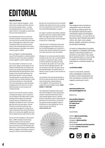move to Doncaster. We're proud that Biscuit Billy's is his new favorite nightlife haunt and that he prefers Donny’s Silver Street to Soho. We also trot off to Bentley to meet Suzanne Wass, a DMBC employee and practicing Shamanic healer, to find out how she transformed a disused garage into a healing space now known as the The Pod (p26). And Donny-born, London-based architect William McKee re-imagines Church Way as a space to hang out in the sun and drink beer (p23).