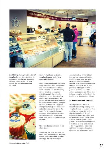 w h a t yo u ’ ve b e e n u p t o s i n c e Cooplands came under new ow n e rs h i p i n J u n e? We l l , t h i n g s h a v e b e e n e x t r e m e l y b u s y s i n ce J u n e 2 0 1 5 . C o o p l a n d s is a household name in South Yo r k s h i r e a n d h a s a n i n c r e d i b l y strong emotive connection w i t h t h e p e o p l e h e r e . S a d l y, the business has been terribly n e g l e c t e d o v e r t h e y e a r s . We picked up the mantle in June and we rolled our sleeves up and got to work. It has been a difficult time for our staff who saw some redundancies earlier on in the y e a r. T h e p r o c e s s o f c h a n g e , which we began to put in place s t r a i g h t a wa y, h a s s o m e t i m e s been hard for us to communicate to them.