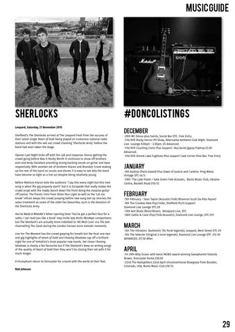 FEBRUARY -5th February - Sean Taylor (Acoustic/Folk) Rhannon Scutt (ex Rita Payne) -9th The Crookes New Pop/Indie, Sheffield PLUS Support Diamond Live Lounge DTC £8 -13th Avit Blues (Rock/Blues), Woolpack Live, DTC -26th Cattle & Cane (Pop/Folk/Acoustic), Diamond Live Lounge, DTC £10