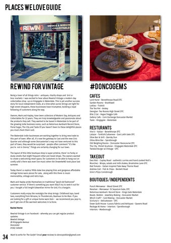 BOUTIQUES/INDEPENDENTS Punch Menswear - Wood Street DTC Revolver - Menswear- St Sepulure Gate, DTC Notorious Aardvark Record Store - Kings Gate Waterdale Beads Bobbin - Jewellery Making - Doncaster Market Which Craft? - Card Making - Doncaster Market Scicluna's - delicatessen - DTC Down Quilt House -Luxury Fabrics and Antiques - Queens Road Reckage At Home - Interiors - Sprotborough Interiors - Mexborough