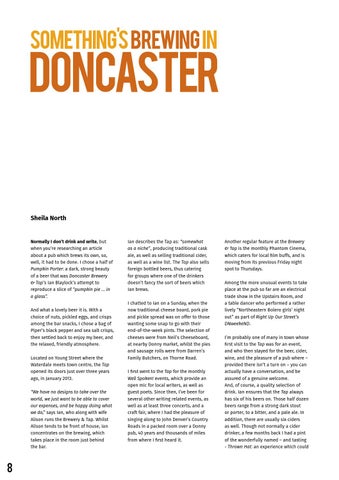 Another regular feature at the Brewery & Tap is the monthly Phantom Cinema, which caters for local film buffs, and is moving from its previous Friday night spot to Thursdays. Among the more unusual events to take place at the pub so far are an electrical trade show in the Upstairs Room, and a table dancer who performed a rather lively “Northeastern Bolero girls’ night out” as part of Right Up Our Street’s DNweekeND. I’m probably one of many in town whose first visit to the Tap was for an event, and who then stayed for the beer, cider, wine, and the pleasure of a pub where – provided there isn’t a turn on – you can actually have a conversation, and be assured of a genuine welcome. And, of course, a quality selection of drink. Ian ensures that the Tap always has six of his beers on. Those half dozen beers range from a strong dark stout or porter, to a bitter, and a pale ale. In addition, there are usually six ciders as well. Though not normally a cider drinker, a few months back I had a pint of the wonderfully named – and tasting - Thrown Hat: an experience which could