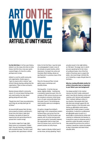 birds. On the first floor, I saw the tools of a photographer’s trade in one of the already occupied studios, whilst downstairs, I bumped into artist and illustrator Mark Holiday, whose art was featured in a previous issue of the Doncopolitan. Plans for the ground floor include gallery space, workshops and possibly shows. This beautiful – if, at the time we spoke, slightly shabby – building has a somewhat mysterious past. One of a complex of 19th century structures near the cemetery’s entrance, Unity House is on a 15-year community lease from Doncaster Council. The building was most recently used as an emergency repair centre. It’s quite a change from Artfuel’s beginnings in the comparatively modern Portland Place, just across from the railway station. That first location was popular, with 18 artists having studio space at one point. Eventually, however, the organisation had to move, that time to St James Court, not far from its present location at Unity House. When I spoke to Mandy, Artfuel wasn’t on the move, strictly speaking. They’d