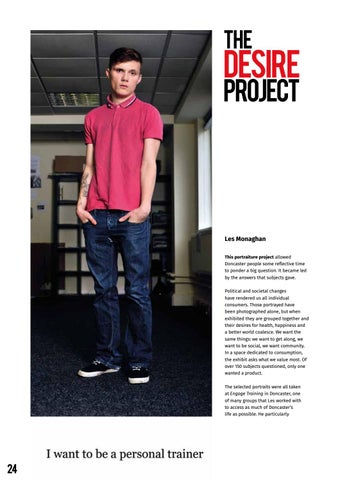 Les Monaghan This portraiture project allowed Doncaster people some reflective time to ponder a big question. It became led by the answers that subjects gave. Political and societal changes have rendered us all individual consumers. Those portrayed have been photographed alone, but when exhibited they are grouped together and their desires for health, happiness and a better world coalesce. We want the same things: we want to get along, we want to be social, we want community. In a space dedicated to consumption, the exhibit asks what we value most. Of over 150 subjects questioned, only one wanted a product. The selected portraits were all taken at Engage Training in Doncaster, one of many groups that Les worked with to access as much of Doncaster’s life as possible. He particularly