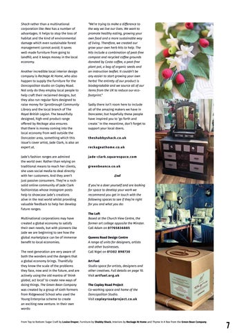 Shack rather than a multinational corporation like Ikea has a number of advantages. It helps to stop the loss of habitat and the kind of environmental damage which even sustainable forest management cannot avoid; it saves well-made furniture from going to landfill; and it keeps money in the local economy. Another incredible local interior design company is Reckage At Home, who also happen to supply the furniture for the Doncopolitan studio on Copley Road. Not only do they employ local people to help craft their reclaimed designs, but they also run regular fairs designed to raise money for Sprotbrough Community Library and the local branch of The Royal British Legion. The beautifully designed, high-end product range offered by Reckage also ensures that there is money coming into the local economy from well outside the Doncaster area, something which this issue’s cover artist, Jade Clark, is also an expert at. Jade’s fashion ranges are admired the world over. Rather than relying on traditional means to reach her clients, she uses social media to deal directly with her customers. And they aren’t just passive consumers. They’re a rocksolid online community of Jade Clark fashionistas whose Instagram posts help to showcase Jade’s creations alive in the real world whilst providing valuable feedback to help her develop future ranges. Multinational corporations may have created a global economy to satisfy their own needs, but with pioneers like Jade we are beginning to see how the global marketplace can be of immense benefit to local economies. The next generation are very aware of both the wonders and the dangers that a global economy brings. Thankfully they know the scale of the problems they face, now and in the future, and are actively using the old mantra of ‘think global, act local’ to create new ways of doing things. The Green Bean Company was created by a group of sixth formers from Ridgewood School who used the Young Enterprise scheme to create an exciting new venture. In their own words: