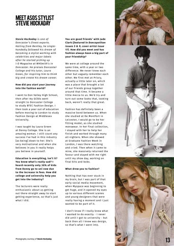 Meet ASOS stylist Stevie Hockaday Stevie Hoc kaday is o n e o f Doncaster ’s f i nes t ex po r ts . Hai li ng fro m Bent ley, h e s in gle ha ndedly fo llowe d h is d re a m o f b e comi ng a styli s t wo r kin g w ith ce lebri ti es and m a j o r la be l s a f ter he star ted pickin g up i-D Magazi ne at W H Sm ith ’s in Doncaster. H e p rais e s D o n ca s te r College and hi s tu to r, La ura Green, fo r i nsp i ri n g h im to th in k b ig and create hi s d re a m ca re e r. How did you st ar t yo u r j o u r ney into t he fashion wo r ld? I went to Don Valley H i g h Sch o o l , t hen after my GCSE s wen t st raight to Doncas ter Co l lege to study BT EC Fas h i o n D es i g n . I t hen took a year o ut o f ed ucati o n before m ov ing to Lo n do n to s tud y Fa shion Design at M i dd les ex U niversity. I was taught by L aura G reen at Donny Col lege. Sh e i s an am az ing wom an. I s ti l l co un t any su ccess I ’ve had in th i s i n d us tr y [a s being] down to h er. Sh e’s ve r y m otiv ational an d w h en s h e bel ieves in you it real l y h el ps yo u b el ieve in yours el f. E d ucat ion is ever yt h i ng , i sn’ t i t ? Yo u know what ’s re a lly sad? I heard recent ly on ly 3 0% o f k i ds from Donny go to u n i n ow du e to t he inc rease in fe e s. How di d co llege and u nive rsi t y he lp yo u get into t he indus t r y? The lecturers were real l y e nthusiastic abou t us getti n g o ut there straight aw ay to s tar t ge tting exper ience, s o th at’s jus t w hat I did.