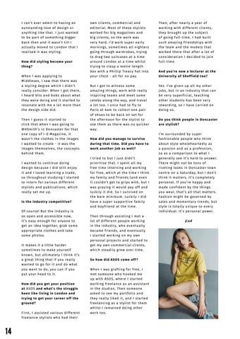 I c an’t ever adm it to h avi n g an o utstanding love o f des i g n o r anything l ike that. I jus t w an ted to be par t of som eth i n g bi g ger back then and it w as n ’t ti l l I ac tual l y m oved to Lo n do n th at I re al ised it was styl i n g . How did st yling be co m e yo u r thing? When I was ap pl yi n g to Middlesex, I saw th at th ere w as a sty l ing degree w h i ch I d i d n ’t re al l y consider. Wh en I go t th ere, I heard bits and b o bs abo ut w h at t hey were doing a n d i t s tar ted to re sonate with m e a lo t m o re th an t he design side d i d . Then I guess it st ar ted to c lick that when I w as go i n g to WHSm ith’s in Don cas ter fo r th at o n e copy of i-D M ag azi n e, i t w asn’t the clothe s i n th e i m ages I wanted to create - i t w as th e im ages them sel ves , th e co n cepts behind them . I wanted to conti n ue do i n g de sign b ecause I d i d s ti l l en joy it and I loved lear n i n g a trade, so throughout stud yi n g I s tar ted to inter n for v ar io us d i fferen t st y l ists and p ub l i cati o n s , w h i ch re al l y set m e up. Is t he indust r y com pe t i t i ve ? Of course! But the i n d us tr y i s so op en and acce s s i ble n ow, it ’ s easy enough fo r anyo n e to ge t an idea togeth er, g rab s o m e ap propr iate clothes an d take so me p hotos. It makes it a l ittle h arder so metim es to m ake yo urs el f known, but ul tim atel y I th i n k i t’s a great thing that i f yo u real l y w anted to go for i t an d do w h at yo u want to do, yo u can i f yo u put your head to i t. How did you get yo u r po si t i o n at ASOS and what’ s t he st r u g g le b e en like living in Lo n do n and tr ying to get your c are e r o ff t h e grou nd? F irst, I assisted var i o us d i fferen t f reel ance styl ists w h o h ad th ei r