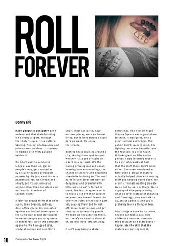 Forever Donny Life Many people in Do n c aste r do n ’t u nderstand that s katebo ard i n g isn’t real l y a sp or t. T h ro ug h t he skater ’s eyes, i t’s a cul ture. Skating, f il m ing, ph o to g raphy an d jo iner y are com bi n ed . I t’s po etr y in m otion with 11 0 % pas s i o n behind it. We don’t want to van d al i s e le dges, wax them up, get i n peop le’s way, get s h o uted at by secur ity guard s o r ran do m passers by. We j us t w an t to s kate peacef ul l y. Yes, we s cream an d shout, b ut it’s no t ai m ed at anyone other than o urs el ves an d o ur boards. Freedo m o f speech, r ight? A fair few p eople th i n k th at we’re sc um , town dossers , jo bles s , dole off ice goers, d i s cr i m i n ated ag ainst and looked dow n upo n i n t he sam e way p eople do tow ard s hom eless people an d d r ug us ers . In actual fact, we ’re th e co m plete o pp osite. We have go o d jo bs , st udy at col lege a n d un i . We’re