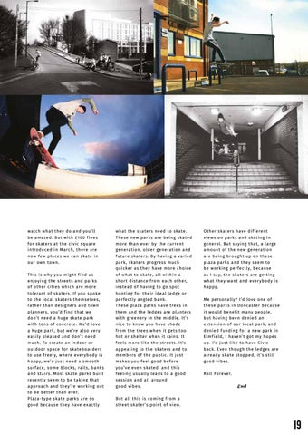w atch what they do an d yo u’l l be am az ed. But w i th £ 1 0 0 f i n es fo r skaters at the ci vi c s q uare introduced in M arch , th ere are now few pl aces we can s kate i n o ur own town. Thi s is why you m i g h t f i n d us e nj oy ing the streets an d par ks o f other cities whi ch are m o re to lerant of skaters . I f yo u s po ke to the local skate rs th em s el ves , ra ther than desig n ers an d tow n planners, you’d f i n d th at we don’t need a huge s kate par k w ith tons of conc rete. We’d love a huge p ar k, b ut we’re al s o ver y e asil y pleased an d do n ’t n eed much. To create an i n do o r o r o utdoor sp ace fo r s katebo arders to use freel y, where ever ybo d y i s happy, we’d j ust need a s m o o th su r face, som e blocks , rai l s , ban ks and stairs. Most s kate par ks bui l t re centl y seem to be taki n g th at approach and they’re wo r ki n g o ut to b e better than ever. P laz a-typ e skate par ks are s o go od b ecause they h ave ex actl y