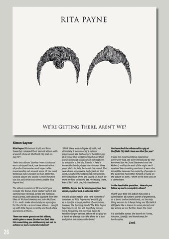 Simon Saynor Simon Saynor Rita Payne (Rhiannon Scutt and Pete Sowerby) released their second album with a launch show at Sheffield City Hall on July 10th. Their first album ‘Stories From A Suitcase’ was a stripped back, raw demonstration of perfect harmonies and impeccable musicianship set around some of the most gorgeous tunes known to man. With this second album the sound is more fleshed out but still with that unmistakable Rita Payne feel. The album consists of 12 tracks (if you include the bonus track ‘Ashes’) which are earning rave reviews across the national music press, with glowing support from the likes of Richard Hawley and John McClure. It is – and I make absolutely no apologies for the cliché – a must-have album. I caught up with Rita Payne recently and fired a few questions at them... There are more guests on this album, which gives a more fleshed out feel. Was this something you deliberately set out to achieve or just a natural evolution?