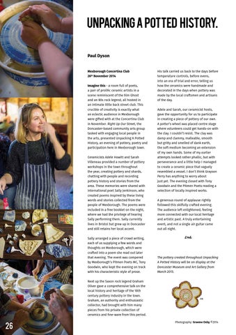 Unpacking a Potted History. Paul Dyson Mexborough Concertina Club 26th November 2014 Imagine this - a room full of poets, a pair of prolific ceramic artists in a scene reminiscent of the film Ghost and an 80s rock legend, all hosted in an intimate little back street club. This crucible of creativity is exactly what an eclectic audience in Mexborough were gifted with at the Concertina Club in November. Right Up Our Street, the Doncaster-based community arts group tasked with engaging local people in the arts, presented Unpacking A Potted History, an evening of pottery, poetry and participation here in Mexborough town. Ceramicists Adele Howitt and Sarah Villeneau provided a number of pottery workshops in the town throughout the year, creating pottery and shards, chatting with people and recording pottery history and stories from the area. These memories were shared with international poet Sally Jenkinson, who created poems inspired by these living words and stories collected from the people of Mexborough. The poems were included in a free booklet on the night, where we had the privilege of hearing Sally performing them. Sally currently lives in Bristol but grew up in Doncaster and still retains her local accent. Sally arranged a piece of crowd writing, each of us supplying a few words and thoughts on Mexborough, which were crafted into a poem she read out later that evening. The event was compered by Mexborough’s Pitmen Poets MC, Tony Goodwin, who kept the evening on track with his characteristic style of prose. Next up the Saxon rock legend Graham Oliver gave a comprehensive talk on the local history and heritage of the 18th century pottery industry in the town. Graham, an authority and enthusiastic collector, had brought with him many pieces from his private collection of ceramics and fine-ware from this period.
