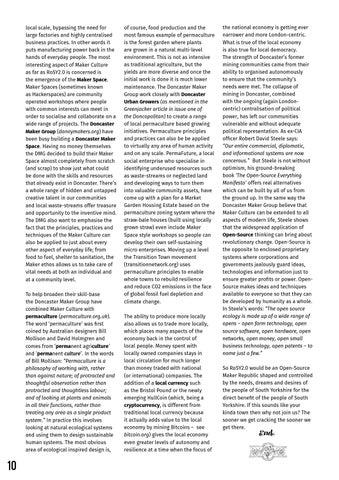 local scale, bypassing the need for large factories and highly centralised business practices. In other words it puts manufacturing power back in the hands of everyday people. The most interesting aspect of Maker Culture as far as RoSY2.0 is concerned is the emergence of the Maker Space. Maker Spaces (sometimes known as Hackerspaces) are community operated workshops where people with common interests can meet in order to socialise and collaborate on a wide range of projects. The Doncaster Maker Group (donnymakers.org) have been busy building a Doncaster Maker Space. Having no money themselves the DMG decided to build their Maker Space almost completely from scratch (and scrap) to show just what could be done with the skills and resources that already exist in Doncaster. There’s a whole range of hidden and untapped creative talent in our communities and local waste-streams offer treasure and opportunity to the inventive mind. The DMG also want to emphasise the fact that the principles, practices and techniques of the Maker Culture can also be applied to just about every other aspect of everyday life; from food to fuel, shelter to sanitation, the Maker ethos allows us to take care of vital needs at both an individual and at a community level. To help broaden their skill-base the Doncaster Maker Group have combined Maker Culture with permaculture (permaculture.org.uk). The word ‘permaculture’ was first coined by Australian designers Bill Mollison and David Holmgren and comes from ‘permanent agriculture’ and ‘permanent culture’. In the words of Bill Mollison: “Permaculture is a philosophy of working with, rather than against nature; of protracted and thoughtful observation rather than protracted and thoughtless labour; and of looking at plants and animals in all their functions, rather than treating any area as a single product system.” In practice this involves looking at natural ecological systems and using them to design sustainable human systems. The most obvious area of ecological inspired design is,