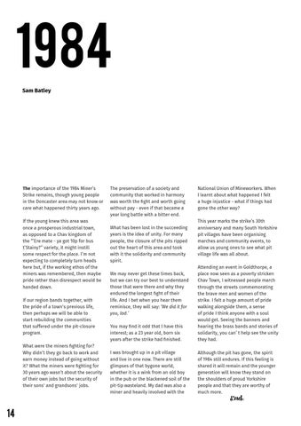 National Union of Mineworkers. When I learnt about what happened I felt a huge injustice - what if things had gone the other way? This year marks the strike’s 30th anniversary and many South Yorkshire pit villages have been organising marches and community events, to allow us young ones to see what pit village life was all about.