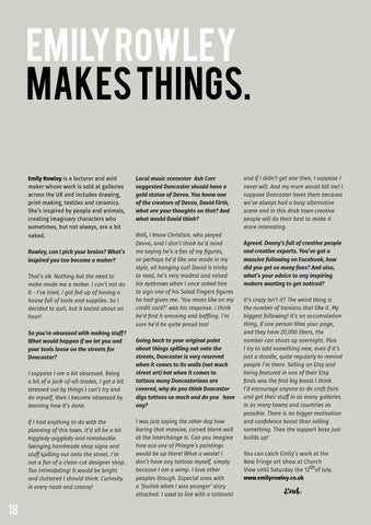 EMILY ROWLEY MAKES THINGS. Emily Rowley is a lecturer and avid maker whose work is sold at galleries across the UK and includes drawing, print-making, textiles and ceramics. She’s inspired by people and animals, creating imaginary characters who sometimes, but not always, are a bit naked. Rowley, can I pick your brains? What’s inspired you too become a maker? That’s ok. Nothing but the need to make made me a maker. I can’t not do it - I’ve tried, I got fed up of having a house full of tools and supplies. So I decided to quit, but it lasted about an hour! So you’re obsessed with making stuff? What would happen if we let you and your tools loose on the streets for Doncaster? I suppose I am a bit obsessed. Being a bit of a jack-of-all-trades, I get a bit stressed out by things I can’t try and do myself, then I become obsessed by learning how it’s done. If I had anything to do with the planning of this town, it’d all be a bit higgledy-piggledy and ramshackle. Swinging handmade shop signs and stuff spilling out onto the street. I’m not a fan of a clean-cut designer shop. Too intimidating! It would be bright and cluttered I should think. Curiosity in every nook and cranny!