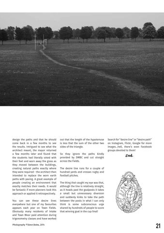 design the paths and that he should come back in a few months to see the results. Intrigued to see what the architect meant, the mayor returned a few months later and found that the students had literally voted with their feet and worn away the grass as they moved between the buildings, creating natural paths exactly where they were required - the architect then intended to replace the worn earth paths with paving. A great example of people creating an environment that exactly matches their needs. It would be fantastic if more planners took this approach or applied it retrospectively. You can see these desire lines everywhere but one of my favourites appears each year on Town Fields. Obviously many residents of Intake and Town Moor paid attention during trigonometry classes and have worked Photography ©Steve Bates, 2014