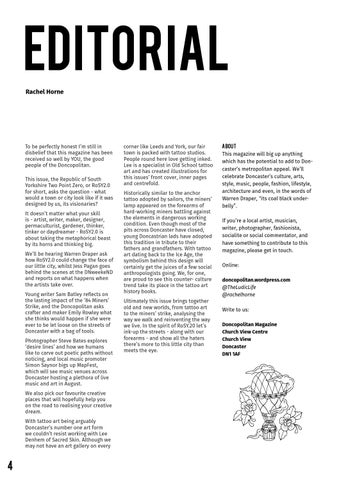corner like Leeds and York, our fair town is packed with tattoo studios. People round here love getting inked. Lee is a specialist in Old School tattoo art and has created illustrations for this issues’ front cover, inner pages and centrefold. Historically similar to the anchor tattoo adopted by sailors, the miners’ lamp appeared on the forearms of hard-working miners battling against the elements in dangerous working condition. Even though most of the pits across Doncaster have closed, young Doncastrian lads have adopted this tradition in tribute to their fathers and grandfathers. With tattoo art dating back to the Ice Age, the symbolism behind this design will certainly get the juices of a few social anthropologists going. We, for one, are proud to see this counter- culture trend take its place in the tattoo art history books. Ultimately this issue brings together old and new worlds, from tattoo art to the miners’ strike, analysing the way we walk and reinventing the way we live. In the spirit of RoSY.20 let’s ink-up the streets - along with our forearms - and show all the haters there’s more to this little city than meets the eye.