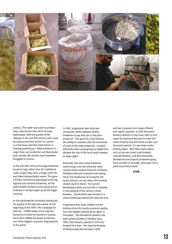 century. This water was used to produce clear, pale Burton Ales which became fashionable. With the growth of the railways in the mid 19th century beer could be transported from Burton to London in a few hours and this made Burton a brewing powerhouse. While breweries in large cities such as Burton and Manchester grew quickly, the smaller local breweries struggled to survive.