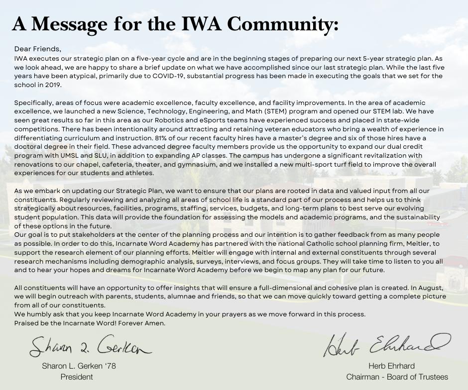 Incarnate Word Academy is a very special place. Since the school’s inception in 1932, “the word made flesh,” Jesus, has been present ever since. Those of you who are still emotionally connected to IWA, know that changes and challenges will never alter the reality and strength of “A Life for God. A Heart for Others.”