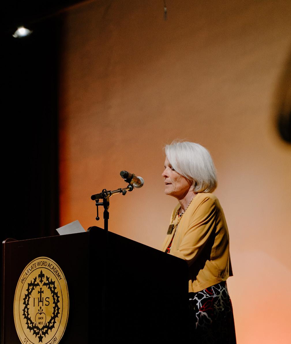 Sharon Gerken ’78 addresses the school community at the Rose and Candle Ceremony on May 10, 2024.