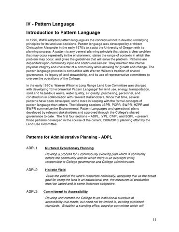 IV - Pattern Language Introduction to Pattern Language In 1990, WWC adopted pattern language as the conceptual tool to develop underlying principles for its land use decisions. Pattern language was developed by architect Christopher Alexander in the early 1970ʼs to assist the University of Oregon with its planning process. A pattern is any general planning principle that states a clear problem that may occur repeatedly in the environment, states the range of contexts in which the problem may occur, and gives the guidelines that will solve the problem. Patterns are dependent upon community input and continuous review. They maintain the internal physical integrity and character of a community while allowing for growth and change. The pattern language process is compatible with Warren Wilsonʼs tradition of shared governance, its legacy of land stewardship, and its use of representative committees to oversee the operations of the College. In the early 1990ʼs, Warren Wilsonʼs Long Range Land Use Committee was charged with developing “Environmental Pattern Language” for land use, energy, transportation, solid and hazardous waste, water quality, air quality, purchasing, personnel, and construction in collaboration with relevant stakeholders. Since that time, several patterns have been developed, some more in keeping with the formal concepts of pattern language than others. The following sections LSPR, PCPR, SWPR, HZPR and BWPR summarize the Environmental Pattern Languages and operational plans developed by relevant stakeholders and approved through the Collegeʼs shared governance to date. The first four sections – ASPL, IVPL, CMPL and BGPL – present those patterns developed in the course of the current, 2009/2010, planning effort by the Land Use Committee.