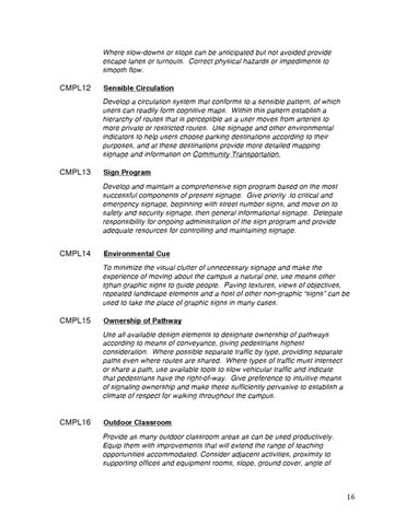 Sensible Circulation Develop a circulation system that conforms to a sensible pattern, of which users can readily form cognitive maps. Within this pattern establish a hierarchy of routes that is perceptible as a user moves from arteries to more private or restricted routes. Use signage and other environmental indicators to help users choose parking destinations according to their purposes, and at these destinations provide more detailed mapping signage and information on Community Transportation.