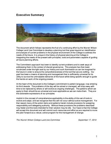 The document which follows represents the fruit of a continuing effort by the Warren Wilson College Land Use Committee to develop a planning tool that goes beyond an identification and analysis of current problems in the physical environment of the College to address the needs of the future. It is unique in the history of physical planning at the College in integrating the needs of the present with principles, tools and parameters capable of guiding all future planning efforts. The Committee始s approach has been to identify current problems and to seek ways of addressing them in the context of shared governance. This analysis has then been scrutinized under the light cast by our history and such illumination as can be imagined for the future in order to ensure the comprehensiveness of the tool that we are crafting. Our goal has been a means of planning and management that is sufficiently universal for its utility to survive the unknowable demands of the future while being specific enough to guide the hands-on work of the ongoing present. At the heart of the document is the College始s commitment to pattern language, now entering its third decade. The problems of the day will be solved or managed, will drop away with time to be replaced by others or will evolve as ongoing challenges. The patterns which we apply to them should be as universal and ever-applicable as we can make them. They are the actionable expressions of our principles. Implicit in the concept of comprehensive applicability is the ability of this set of tools to evolve and adapt, and we recognize that this will not occur without active management. For that reason many of the action items and patterns herein include provisions for assigning responsibility and delegating authority. Without these provisions the problems described may fester and the tools intended for their solution may lie idle. Our hope is that the College will accept this document and will commit such resources and effort as are required to move this plan forward as a robust, active program for the management of change.