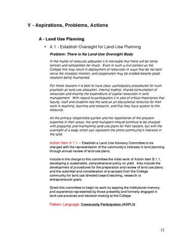 V - Aspirations, Problems, Actions A - Land Use Planning • A.1 - Establish Oversight for Land-Use Planning Problem: There is No Land-Use Oversight Body In the matter of resource allocation it is inevitable that there will be some tension and competition for share. Even in such a civil context as the College this may result in deployment of resources in ways that do not best serve the strategic mission, and cooperation may be eroded despite good relations being maintained. For these reasons it is best to have clear, participatory procedures for such practices as land use allocation, internal trading, shared consumption of resources and sharing the expenditure of capital resources in land management. With regard to participation it is also of critical importance that faculty, staff and students see the land as an educational resource for their work in teaching, learning and research, and that they have access to this resource. As the primary responsible parties and the repositories of the greatest expertise in their areas, the land managers should continue to be charged with preparing and maintaining land-use plans for their sectors, but with the oversight of a body which can represent the entire communityʼs interests in the land.